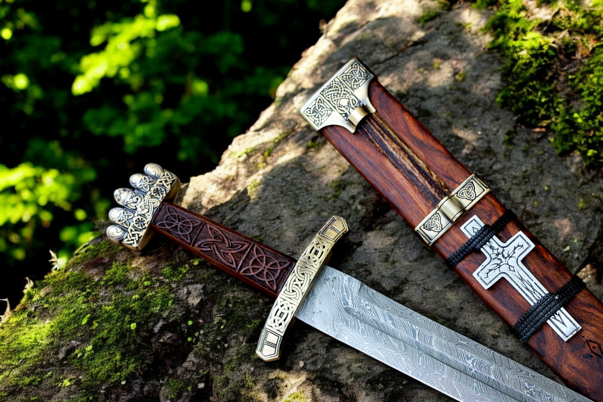 Premium Hand-Forged Damascus Steel Medieval Sword – Decorative Guard, Carved Wooden Handle & Engraved Scabbard